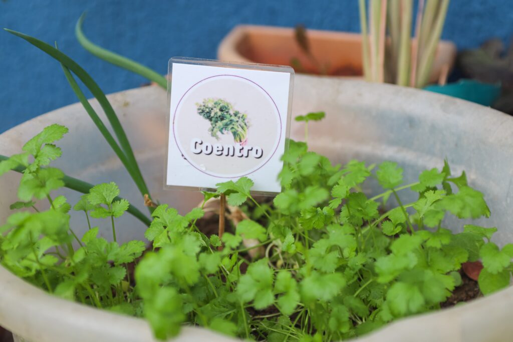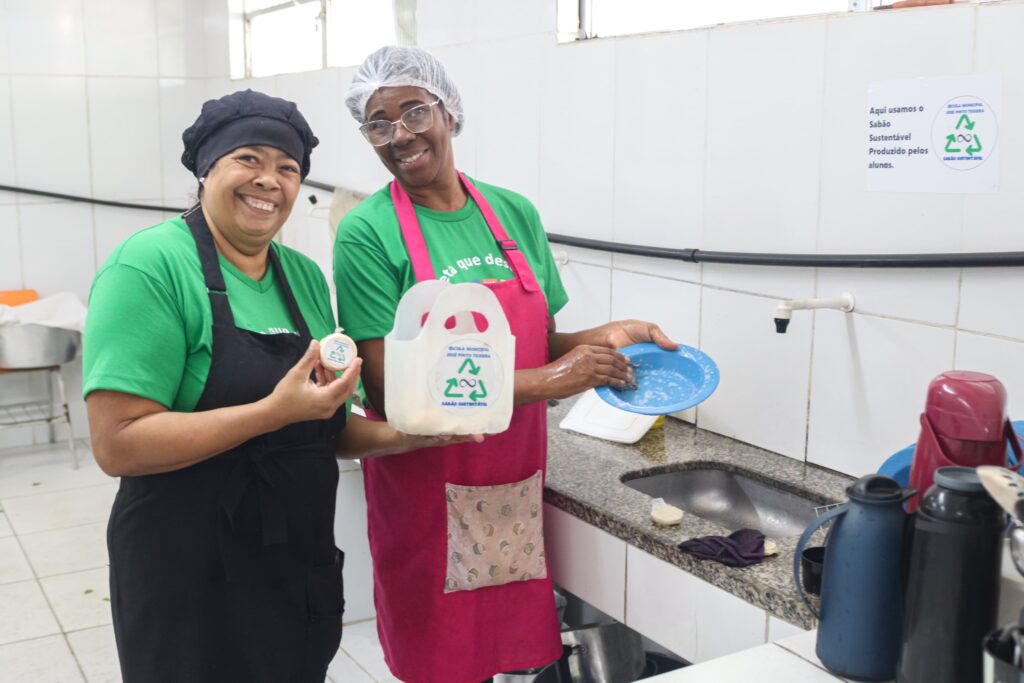 Animada com a produção da horta, Tia Ana se emocionou ao ver os alunos Jonathas da Silva e Emily Sophia colhendo couve na horta da escola. A monitora salientou que muitas verduras e legumes colhidas na escola vão para a merenda das crianças e almoço dos funcionários. Aqui temos, por exemplo, taioba, tomate, alface liso, couve, salsa, coentro e repolho. É tudo orgânico, sem agrotóxico”, comentou Tia Ana, que viu na horta um “medicamento” para ajudar na sua recuperação pós-Covid. “Aproveitamos e pegamos legumes e verduras para fazer para os alunos também. Aqui utilizamos sabão sustentável, produzido na própria escola”, disse a cozinheira Jorgenete Martins, observada pela também cozinheira Simone da Cruz.
