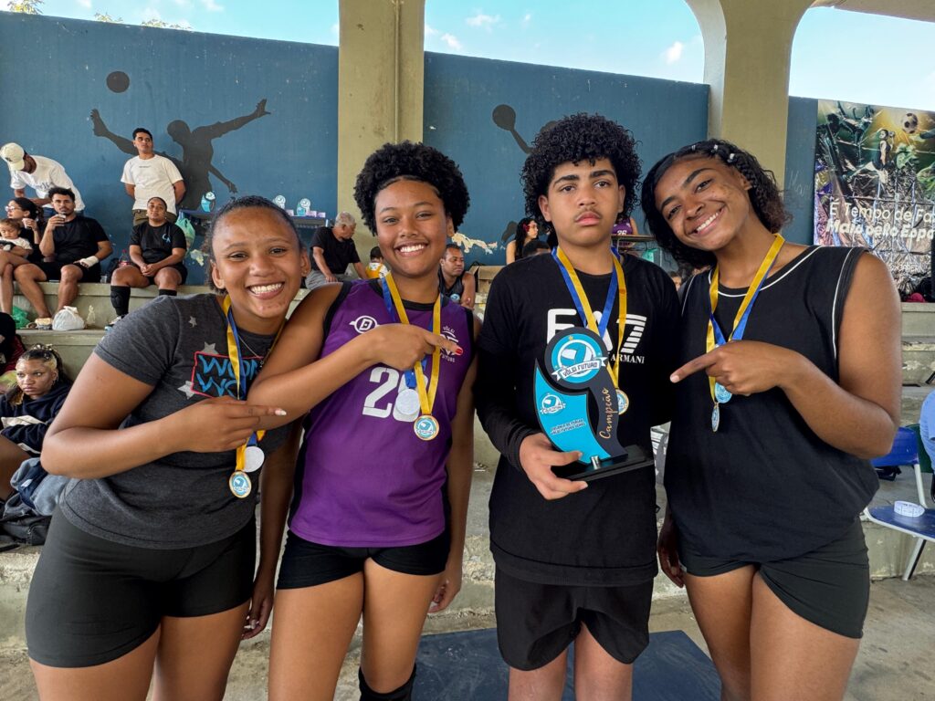 Matheus Inocêncio, de 12 anos, morador do bairro Eucaliptos, liderou sua equipe e conquistou o segundo lugar na categoria iniciante misto. Emocionado com o resultado, ele celebrou. “Estou feliz! Fiquei até sem ação. É a primeira vez que levo para casa um troféu como esse.”As estudantes Evelin Beatriz, de 16 anos, moradora do Jardim Willians, e Geovanna Cristina, de 17, do Jardim Delamare, também representaram sua cidade. Ambas são alunas do 2º ano do CIEP 207 e integram o Projeto Vôlei Futuro, que vem fazendo a diferença em suas trajetórias.