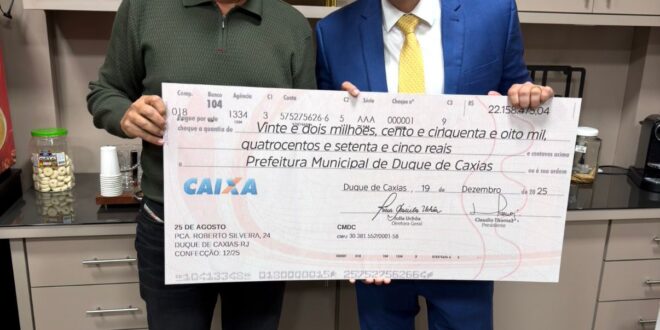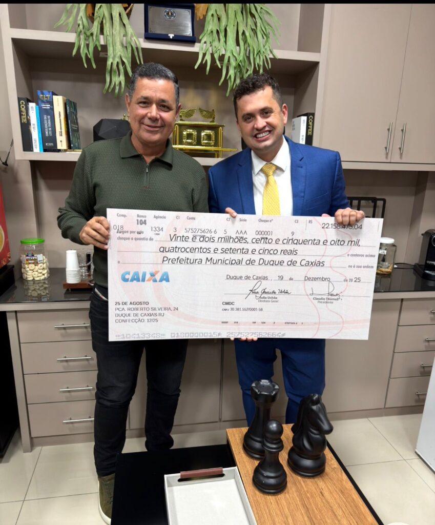 O presidente da Câmara de Duque de Caxias, Claudio Thomaz (PRD), entregou ao prefeito Netinho Reis (MDB), na sexta-feira, 19 de dezembro, o cheque no valor de R$ 22.158.475,04, que representa uma economia histórica da Casa Legislativa.