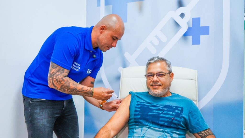 O primeiro vacinado do centro, Kléber Ramos, aproveitou a ida ao shopping para cuidar da saúde